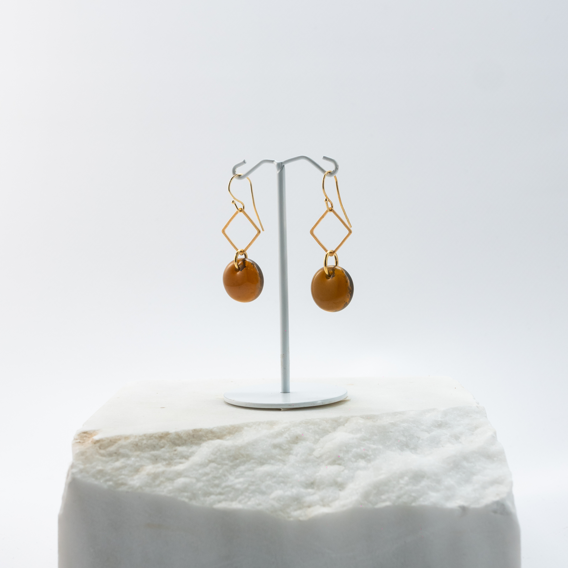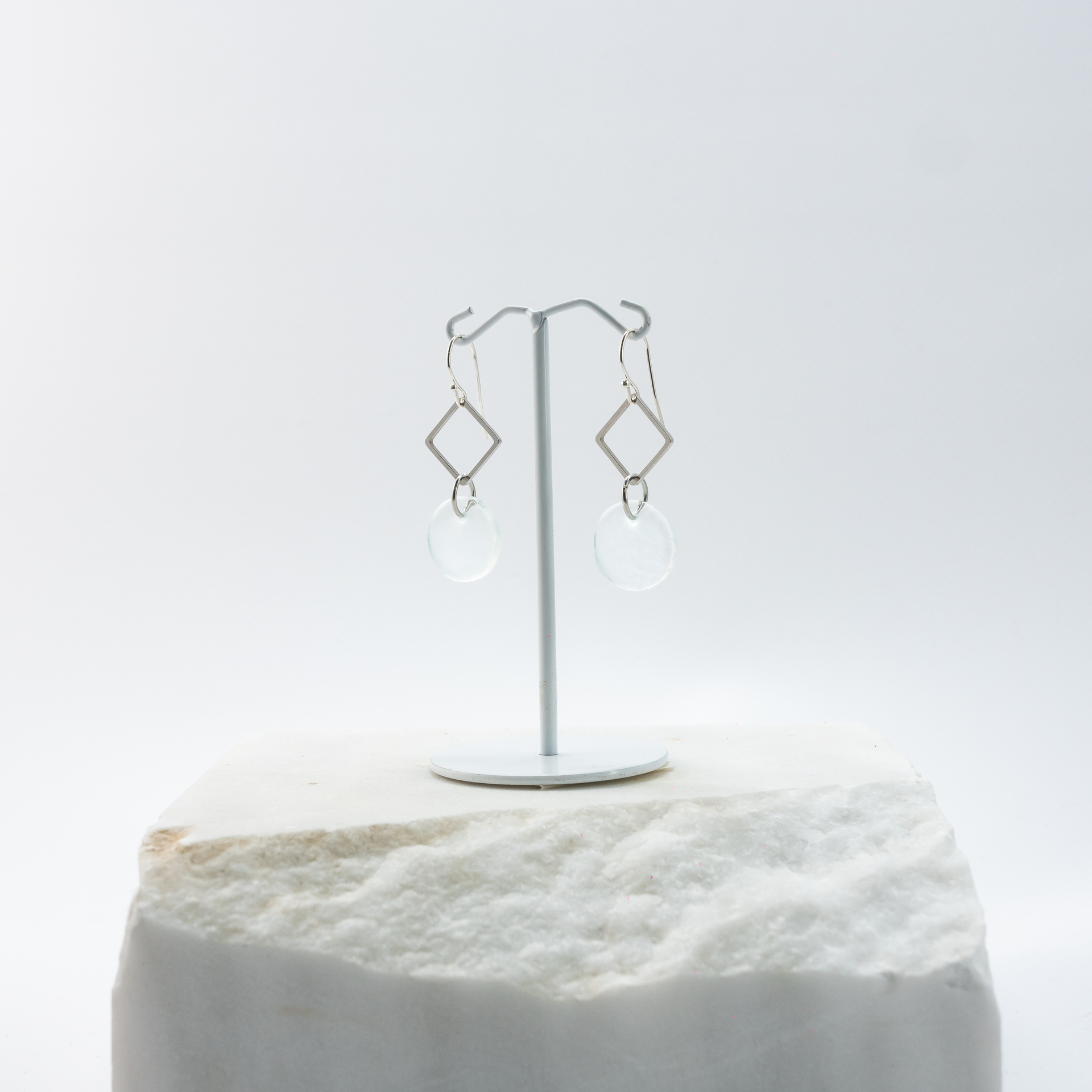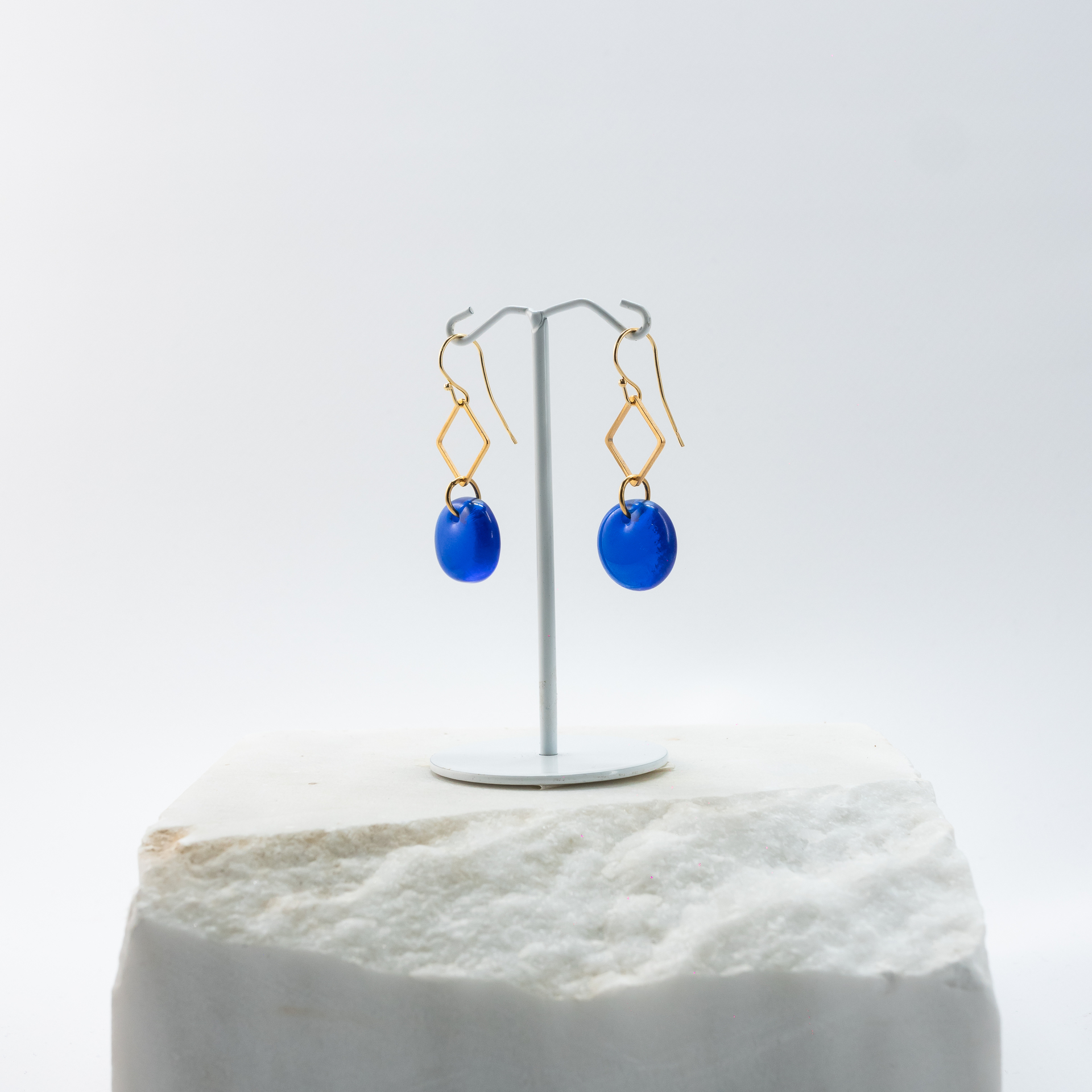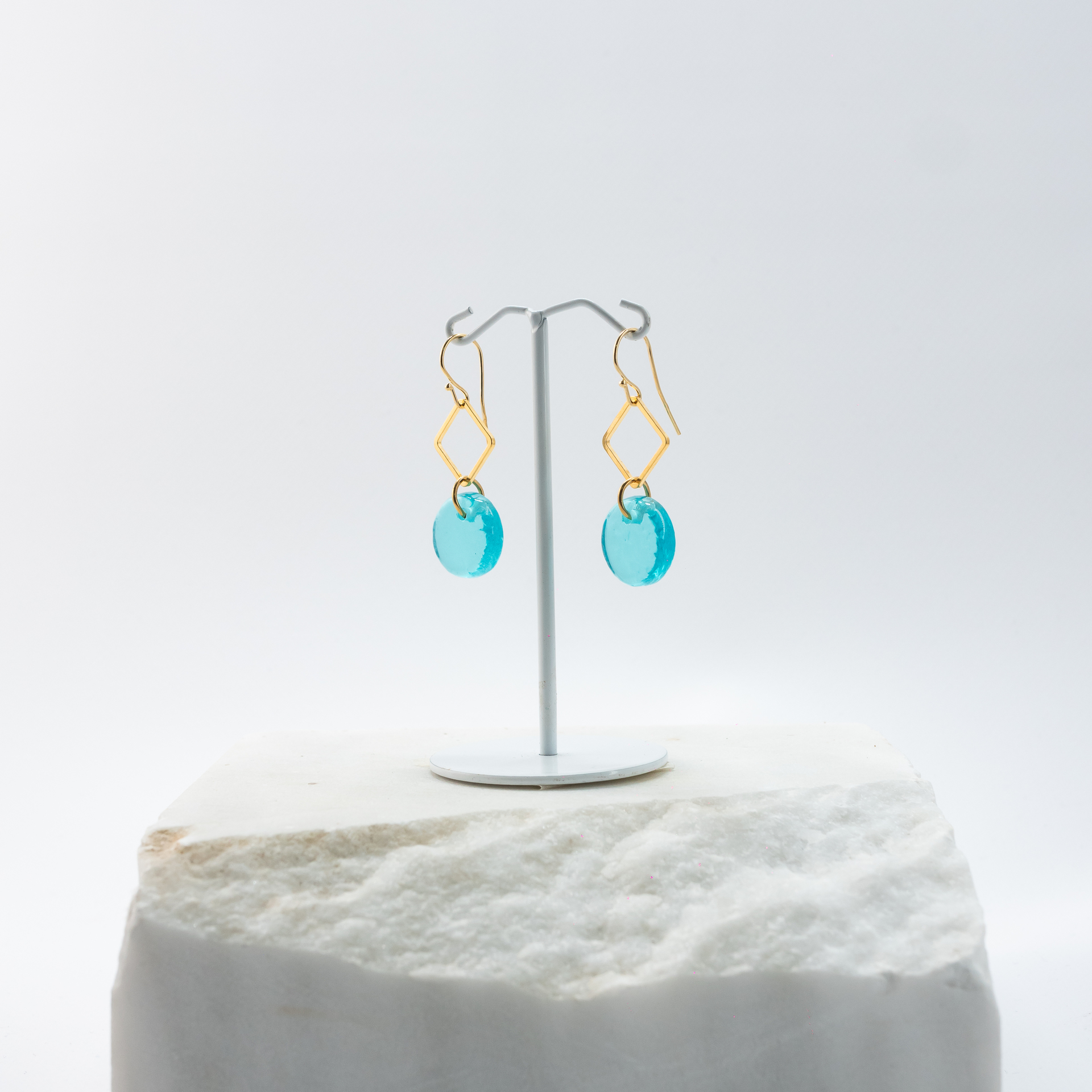 Turquoise round glass elements, crafted from a recycled Bombay Gin bottle, hanging from square stainless-steel metal components. The earring hooks are 925 sterling silver or 18K gold-plated sterling silver, providing a comfortable and secure fit. All metal components are stainless steel, hypoallergenic and nickel-free, suitable for everyday wear and sensitive skin.