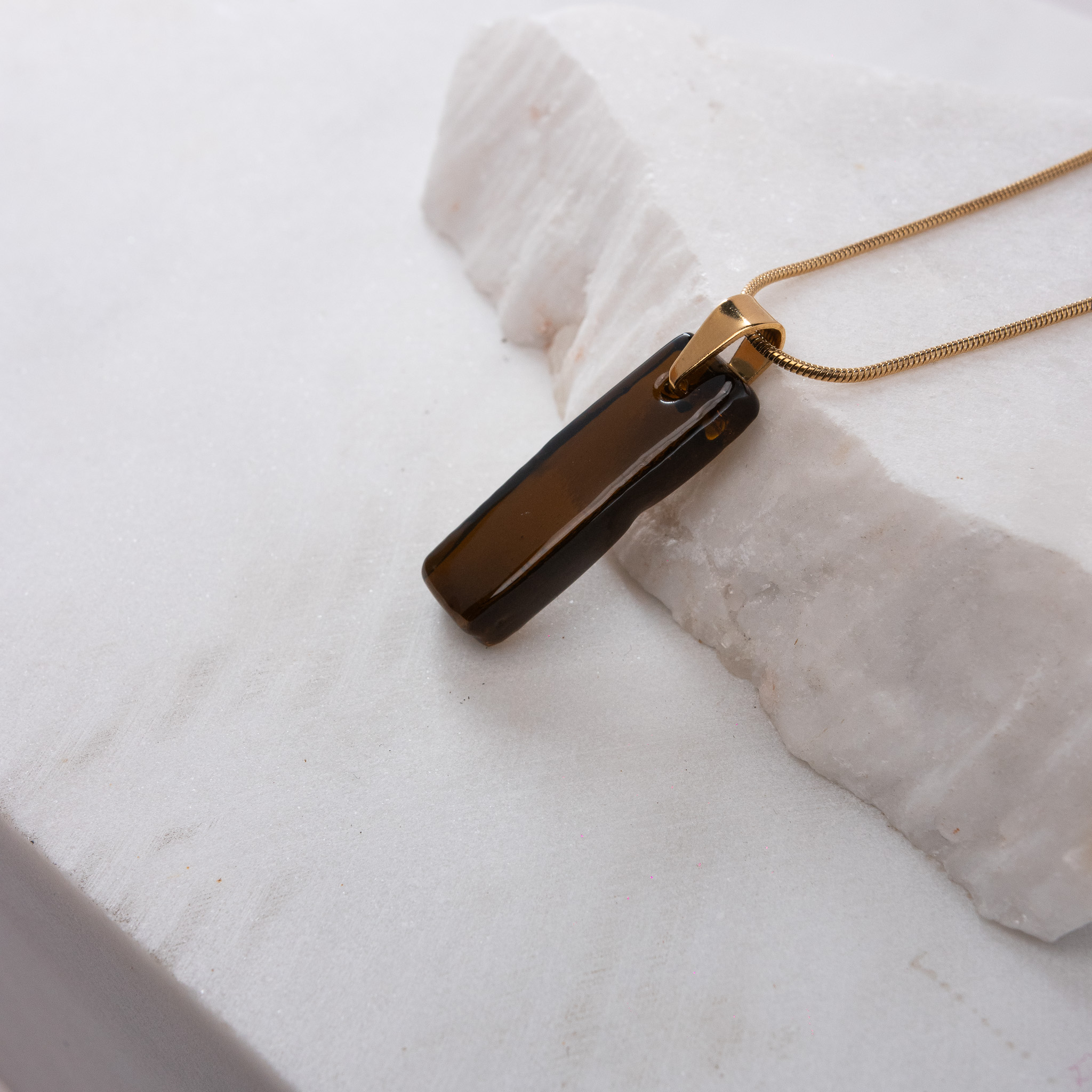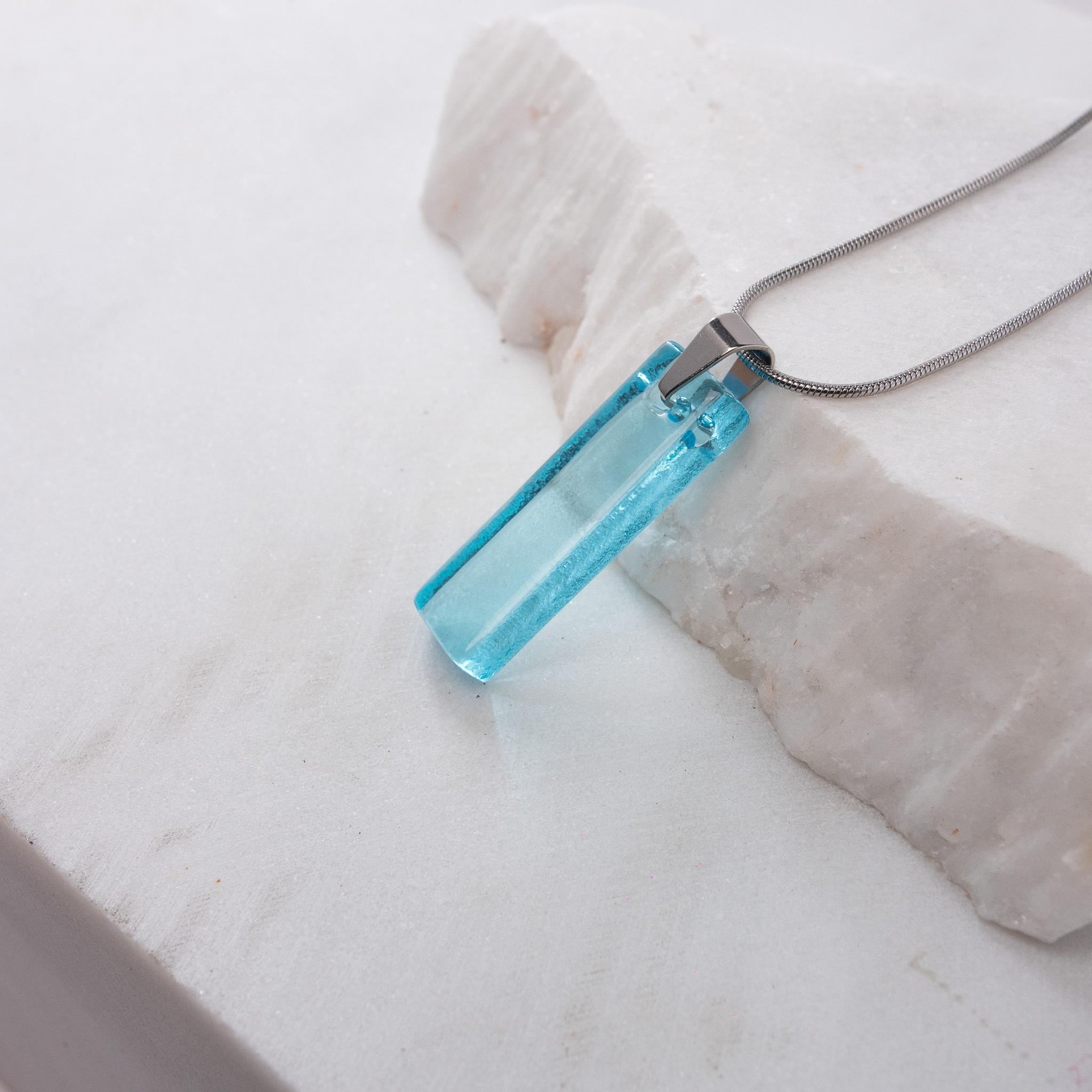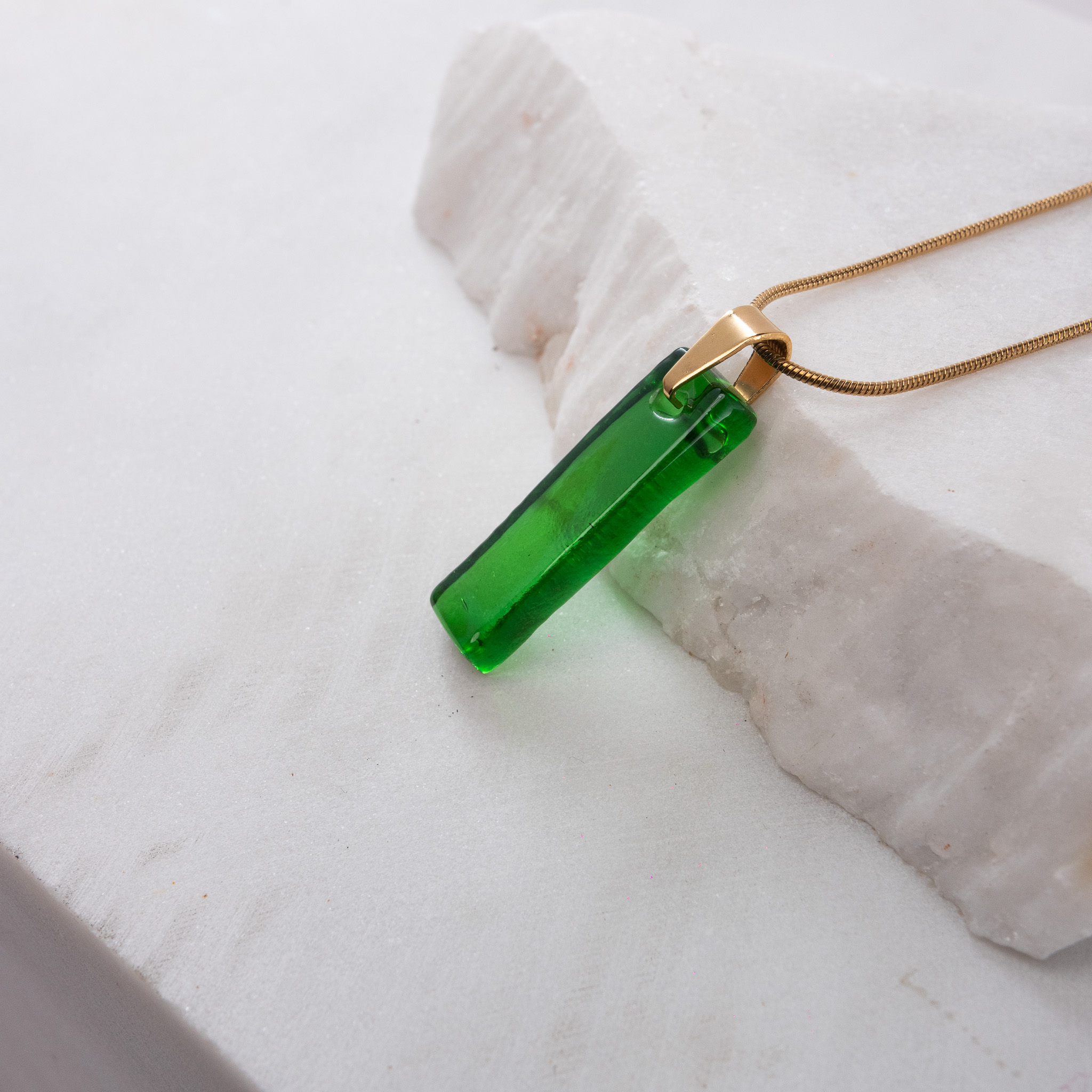 Κολιέ με κρεμαστό γυάλινο ορθογώνιο στοιχείο, φτιαγμένο από ανακυκλωμένο διάφανο μπουκάλι Ούζο. Ατσάλινη αλυσίδα φίδι, πάχους 1,2mm και μήκους 50cm με αλυσιδάκι προέκτασης. Όλα τα μεταλλικά στοιχεία μας είναι ατσάλινα, υποαλλεργικά και χωρίς νικέλιο.