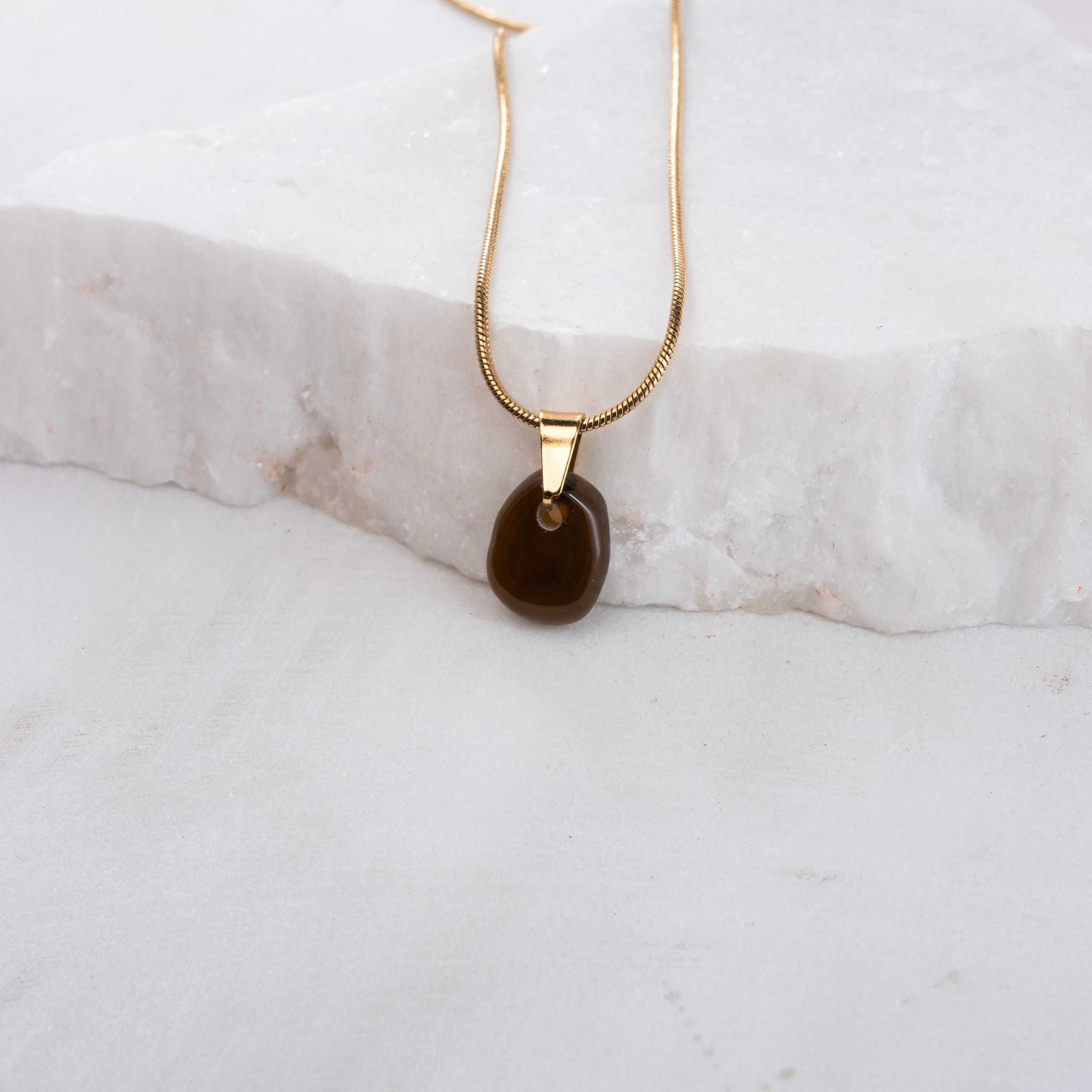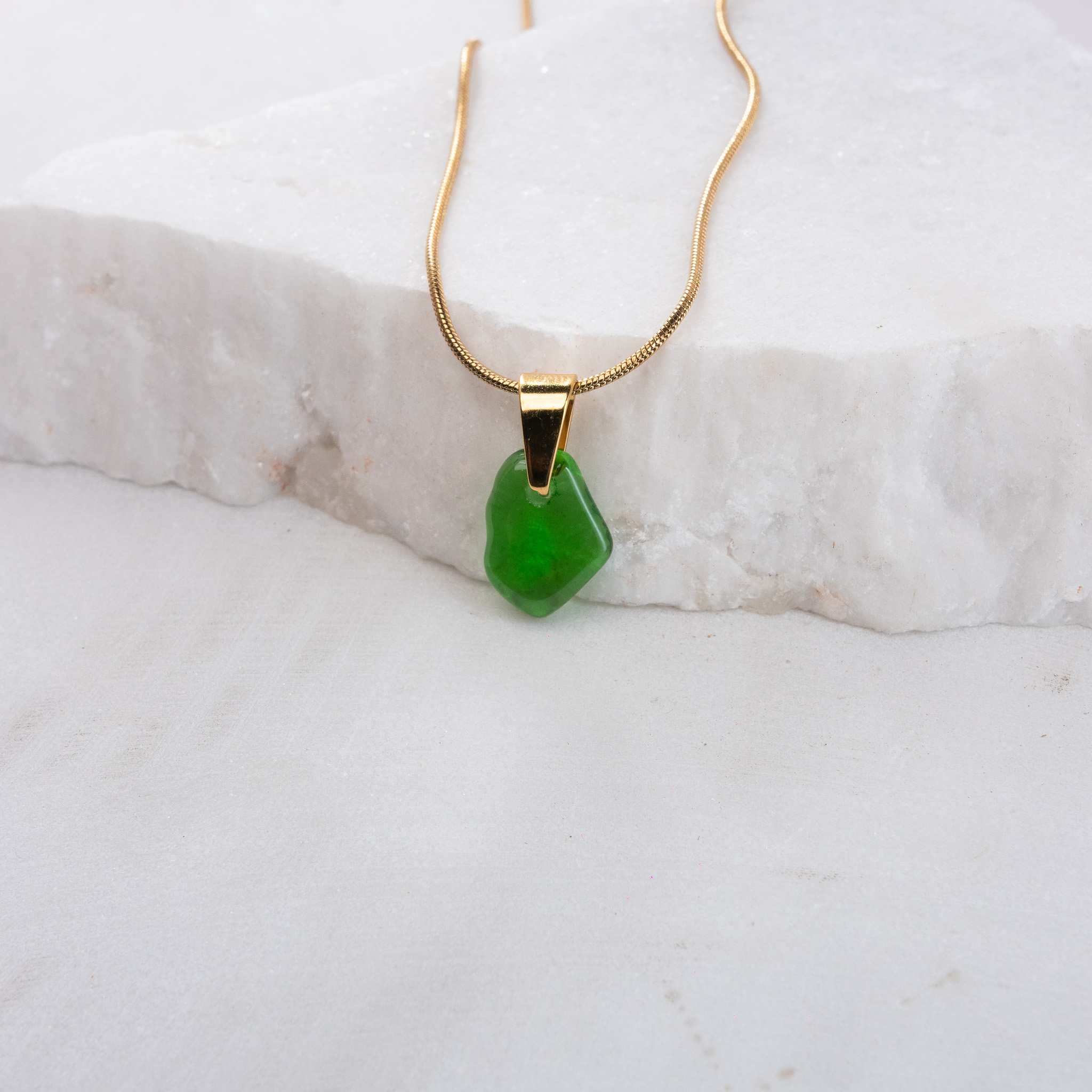 Κολιέ με μικρό γυάλινο στοιχείο ακανόνιστου σχήματος φτιαγμένο από ανακυκλωμένο γυάλινο μπουκάλι κρασιού ,κρεμασμένο σε ατσάλινη αλυσίδα μήκους 45 εκ. Όλα τα μεταλλικά στοιχεία είναι ατσάλινα, υποαλλεργικά και χωρίς νικέλιο, ιδανικά για άνετη καθημερινή χρήση.