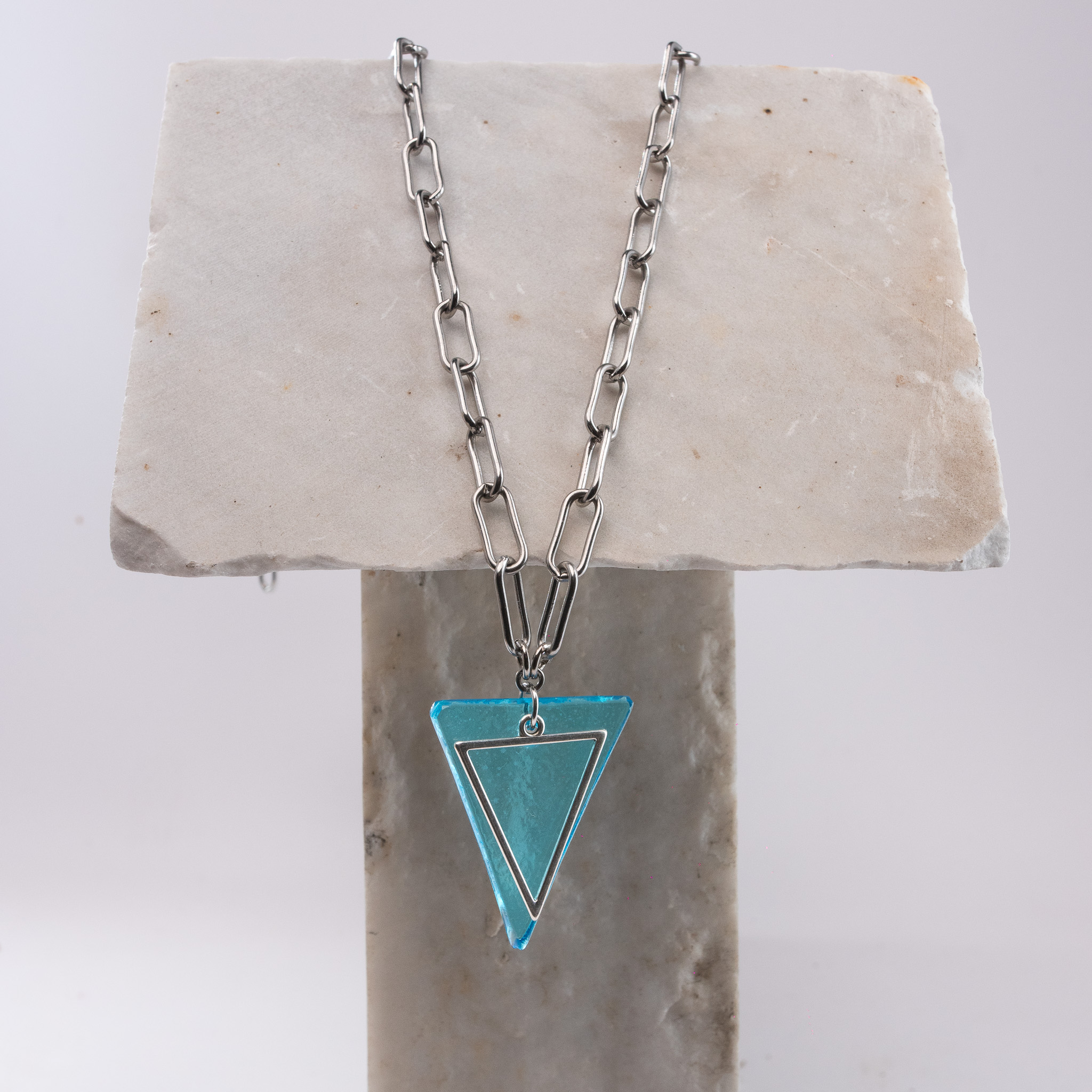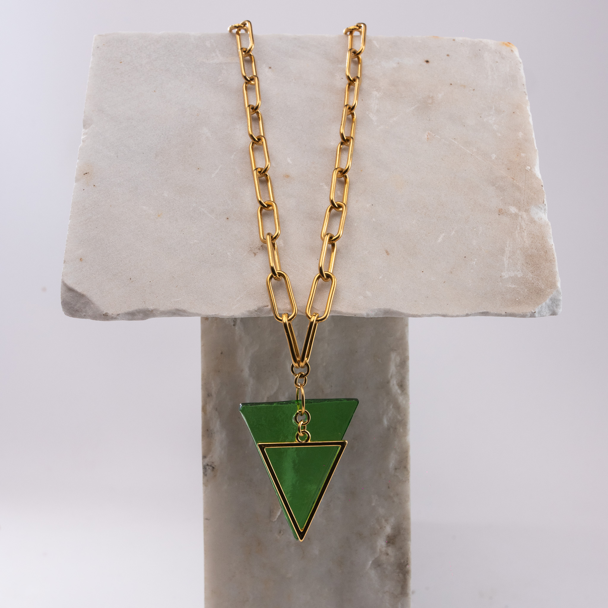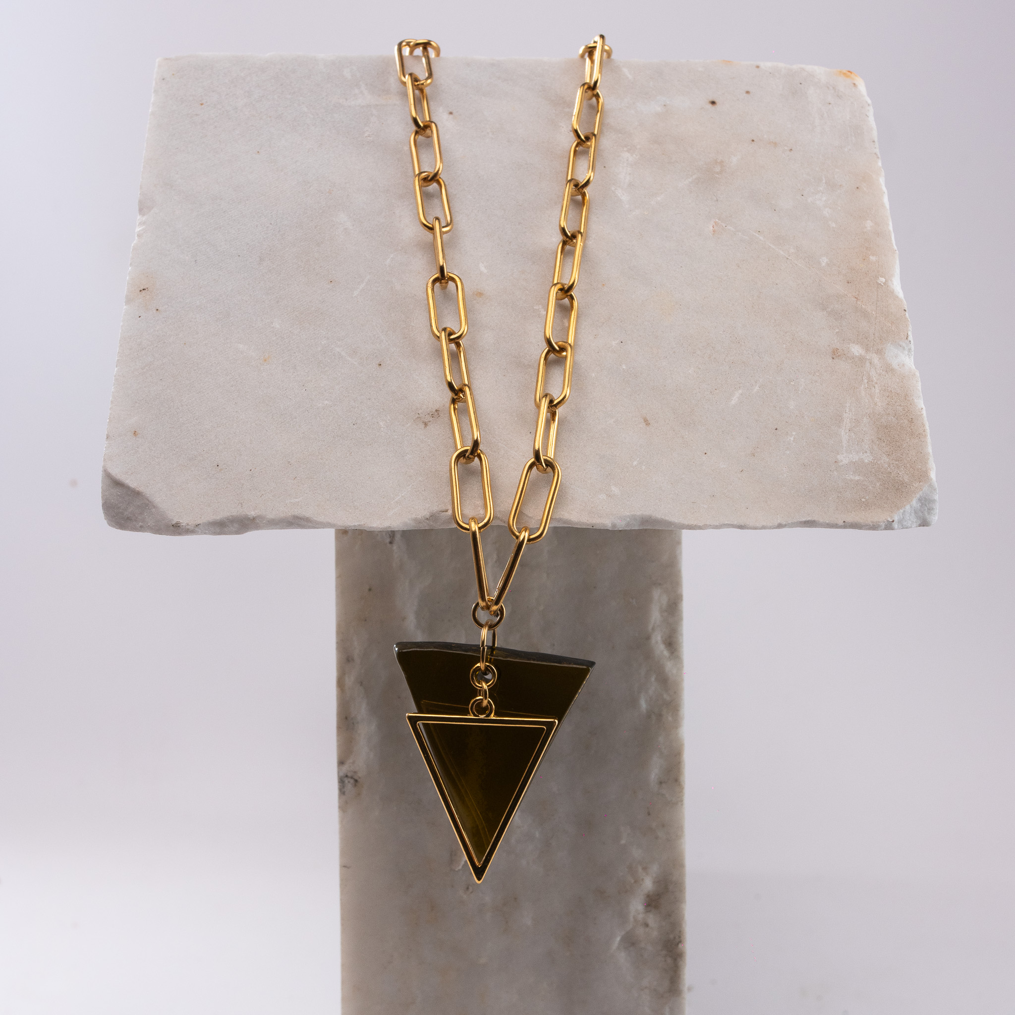 Κολιέ με γεωμετρικό κρεμαστό στοιχείο φτιαγμένο από λαδί ανακυκλωμένο μπουκάλι κρασιού. Το γυάλινο τριγωνικό στοιχείο είναι διακοσμημένο με ένα μεταλλικό τρίγωνο στην μπροστινή του όψη. Γυάλινο στοιχείο: Π 3,5 Χ Μ 4,5 εκ. Ατσάλινη αλυσίδα μήκους 77εκ. Όλα τα μεταλλικά στοιχεία είναι ατσάλινα, υποαλλεργικά και χωρίς νικέλιο.
