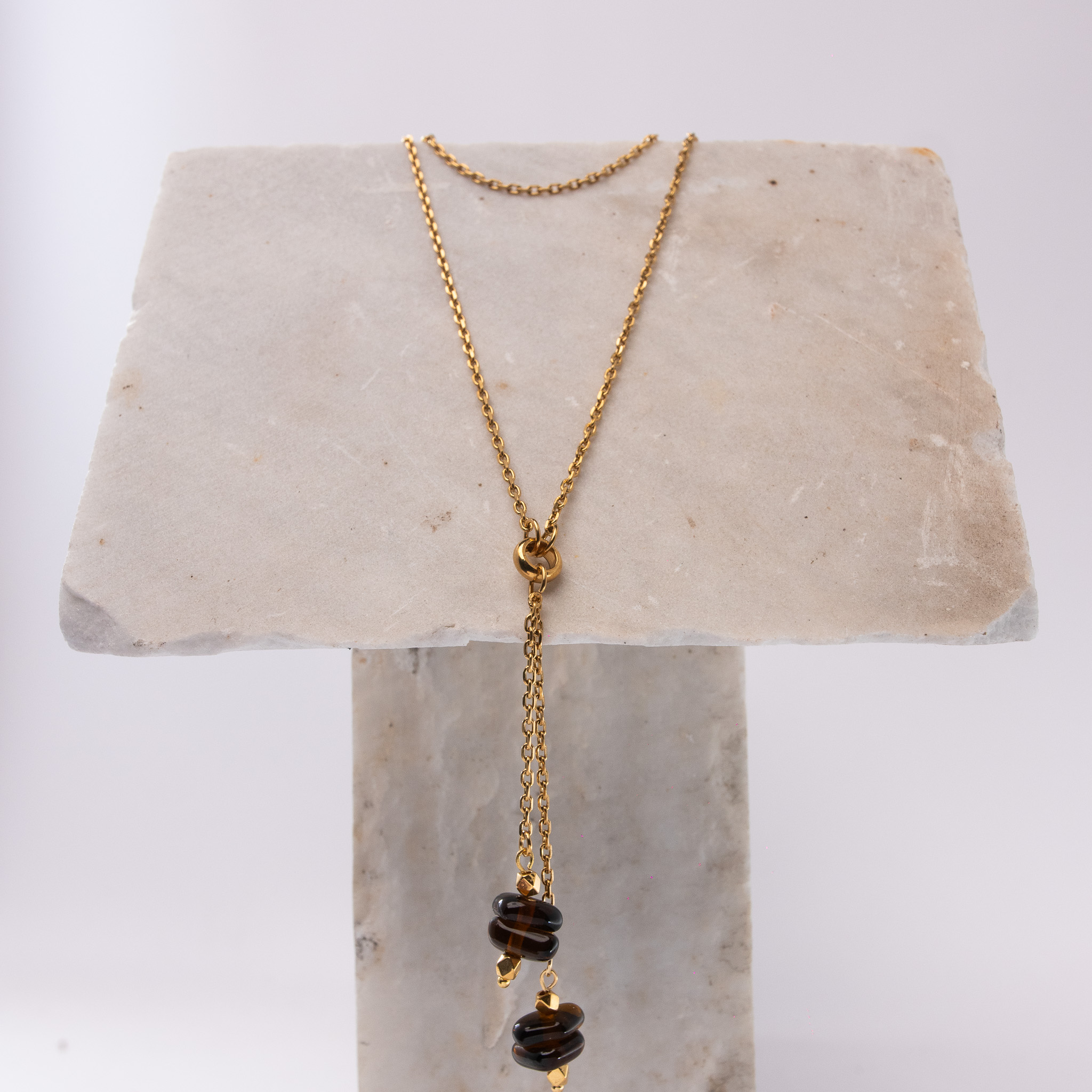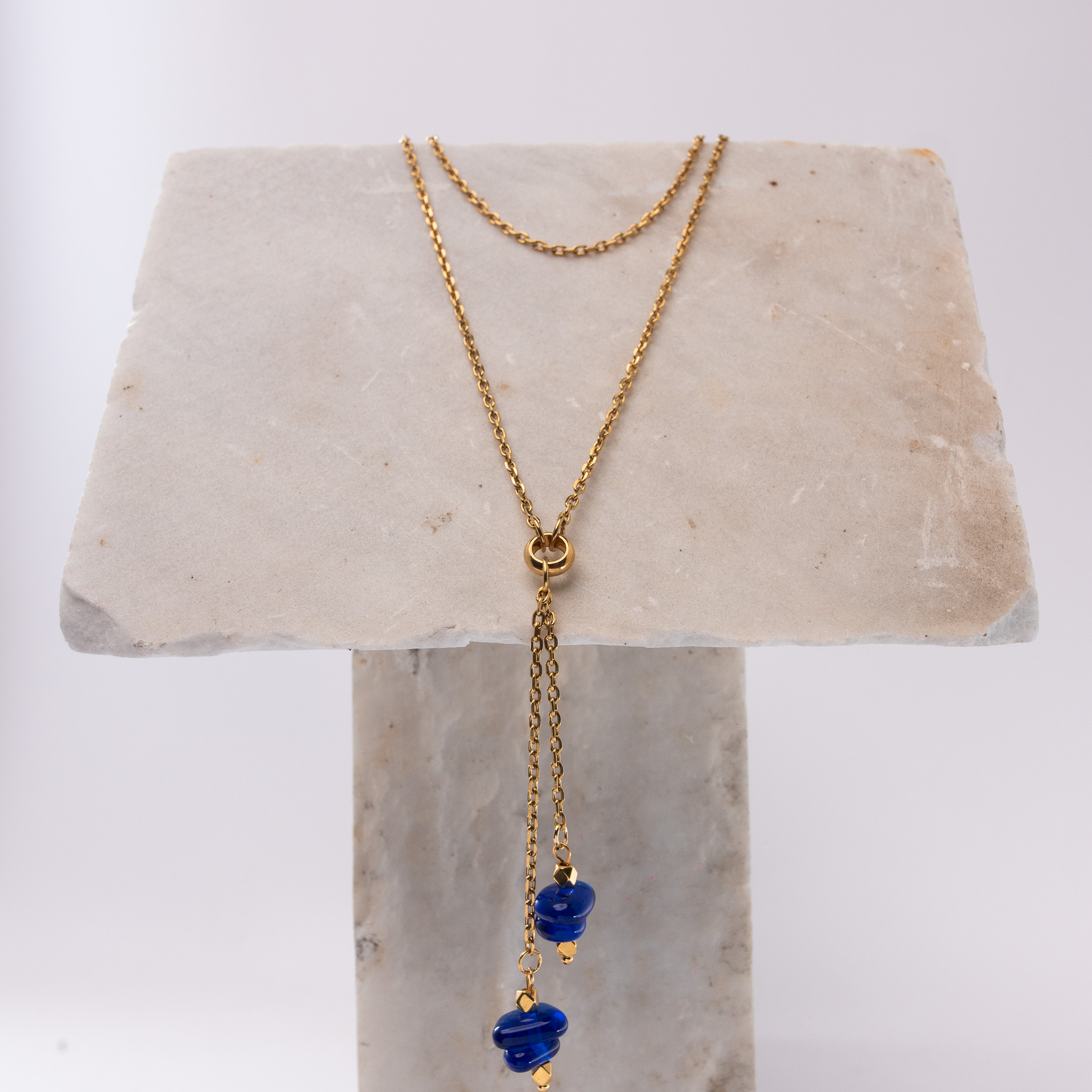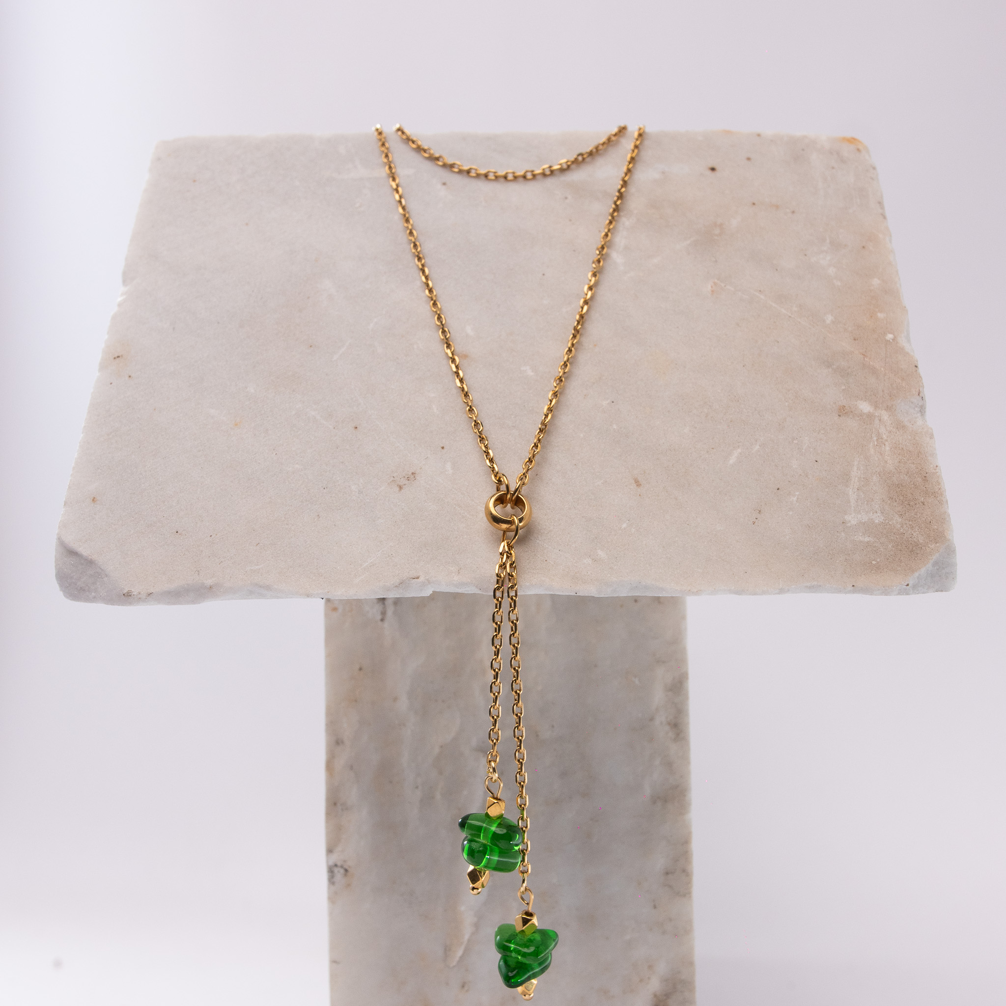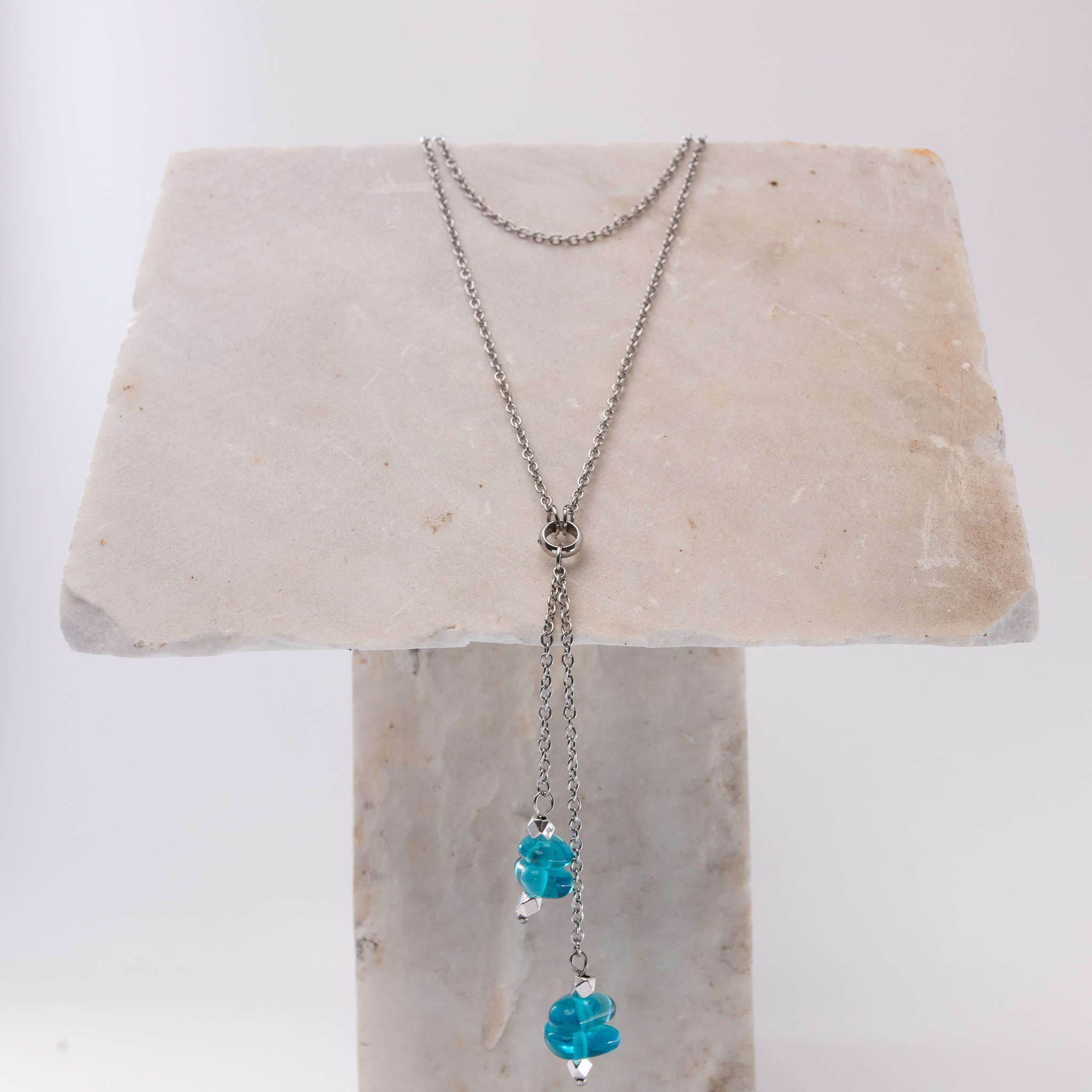 Κολιέ με κρεμαστά μικρά γυάλινα στοιχεία από ανακυκλωμένο διάφανο μπουκάλι Ούζο, σχεδιασμένο σε διπλή αλυσίδα που δημιουργεί ένα σύγχρονο, ανάλαφρο layering αποτέλεσμα. Διαθέτει ατσάλινη αλυσίδα, με τη μικρή αλυσίδα μήκους 35 εκ. και τη μεγαλύτερη αλυσίδα μήκους 55 εκ., προσφέροντας κίνηση και ισορροπία στο κόσμημα.