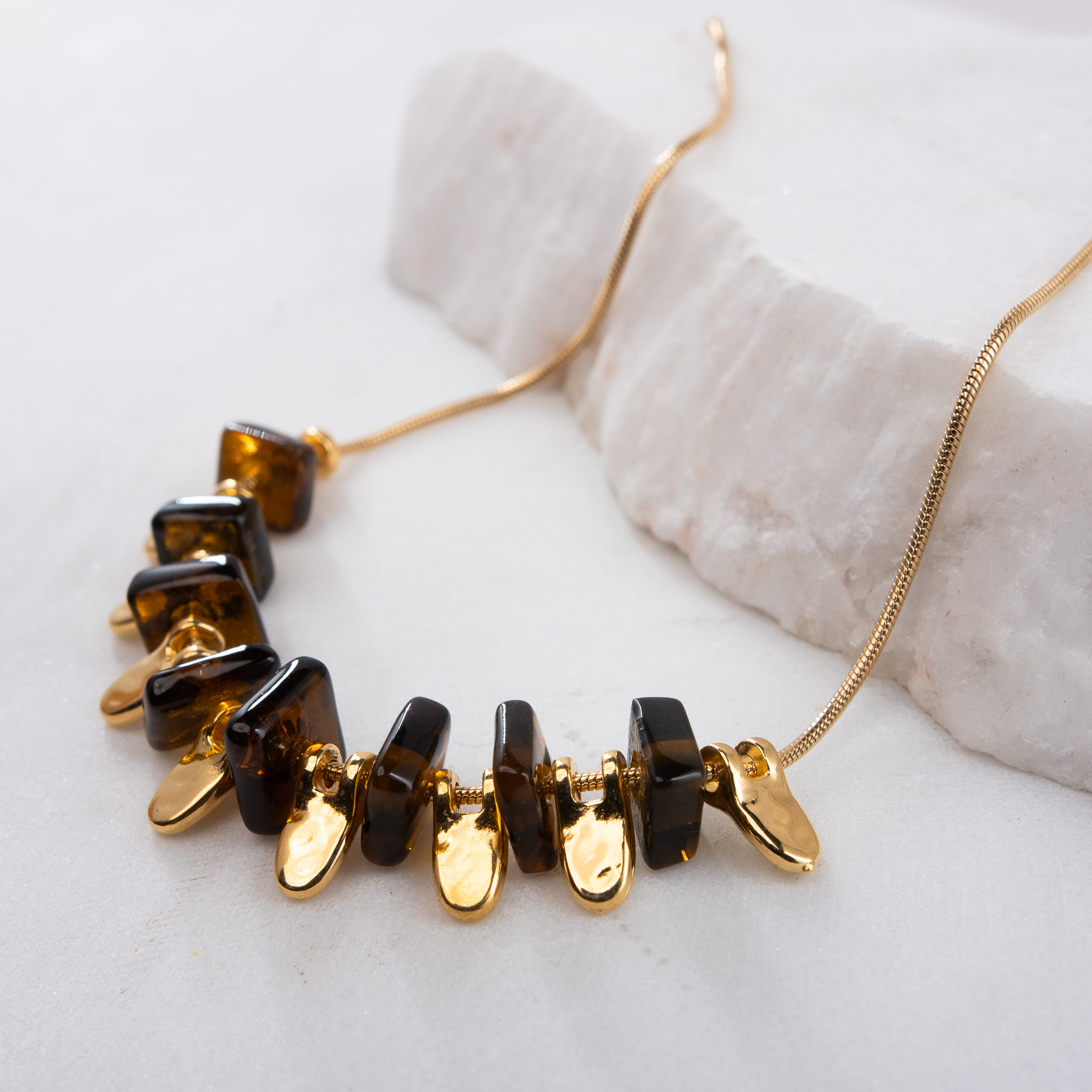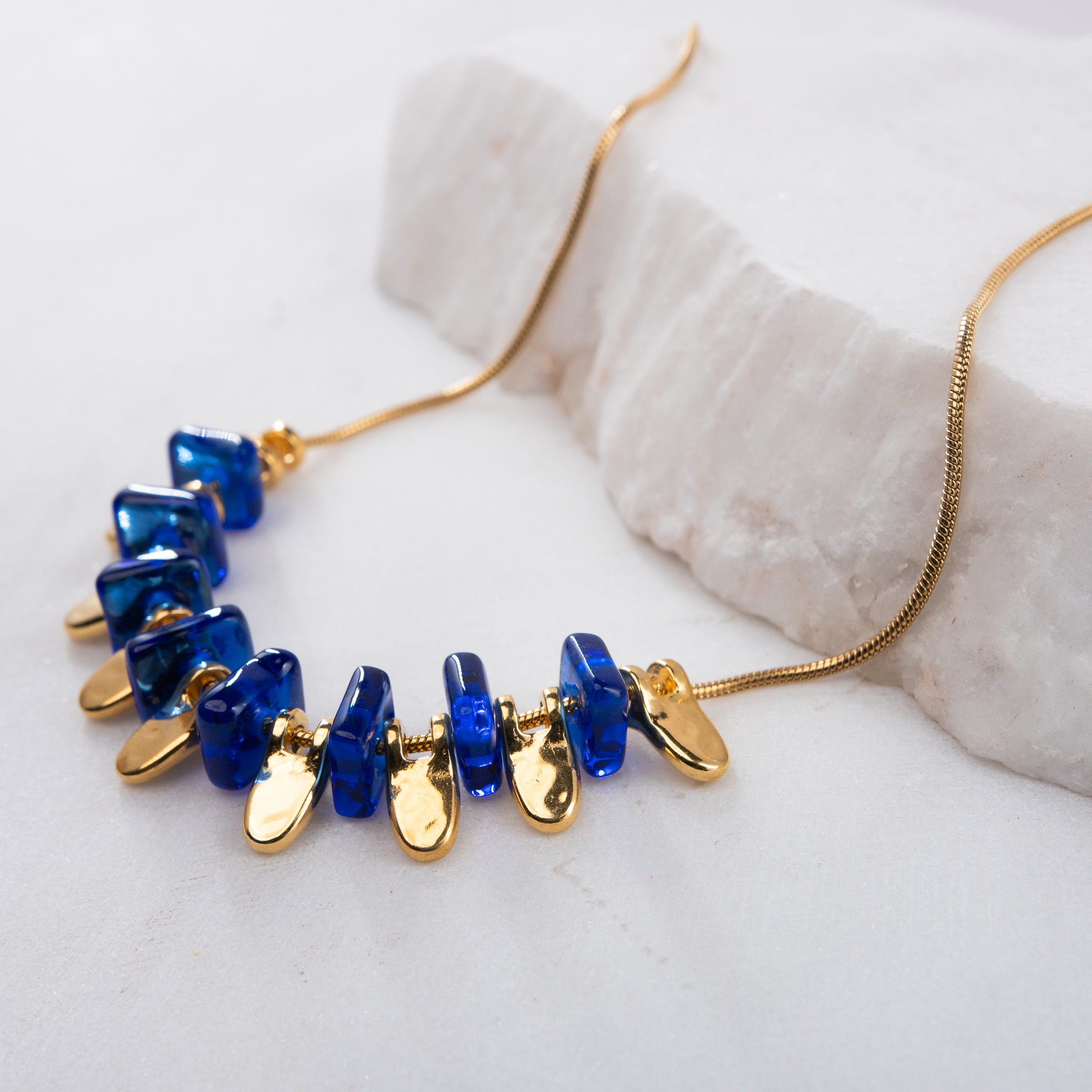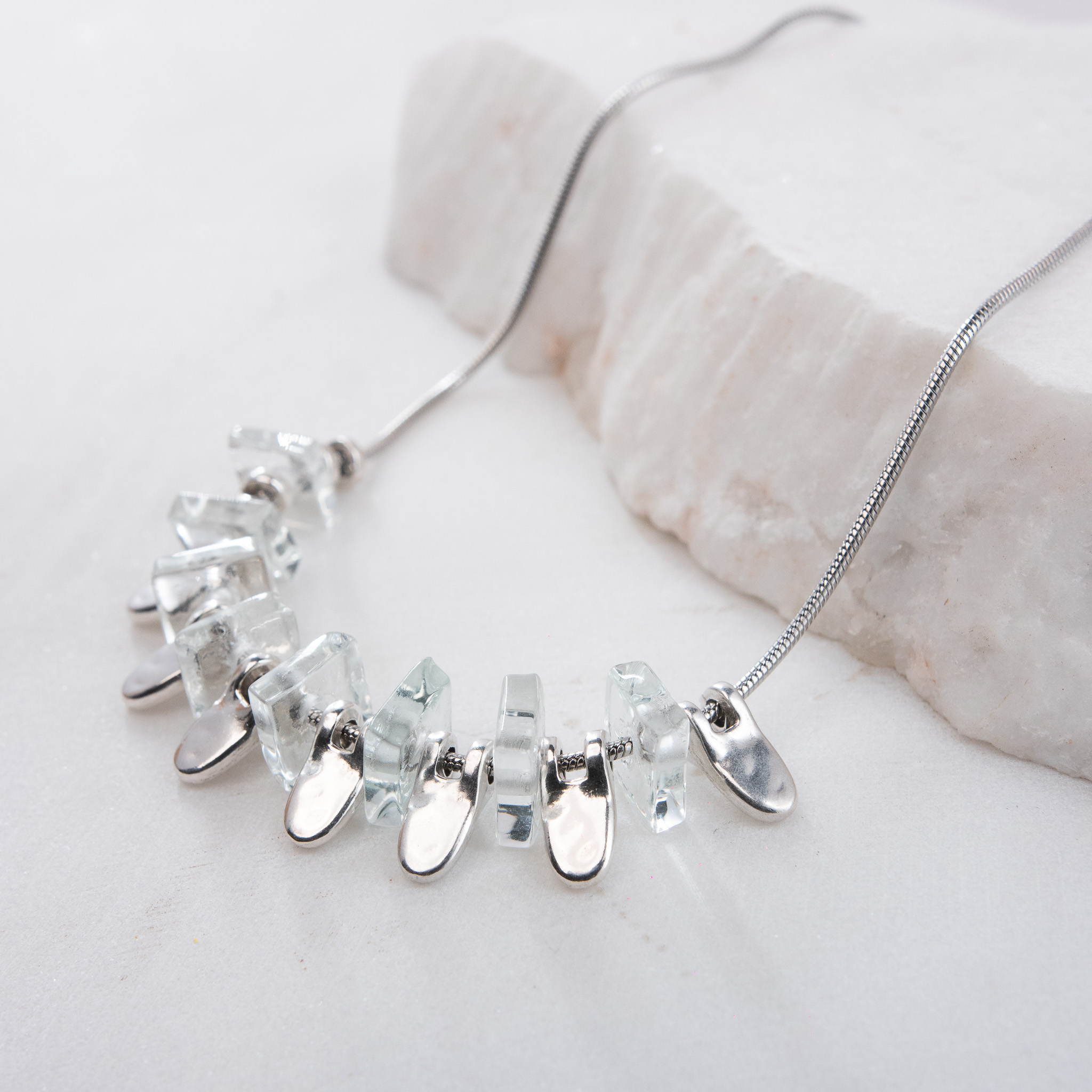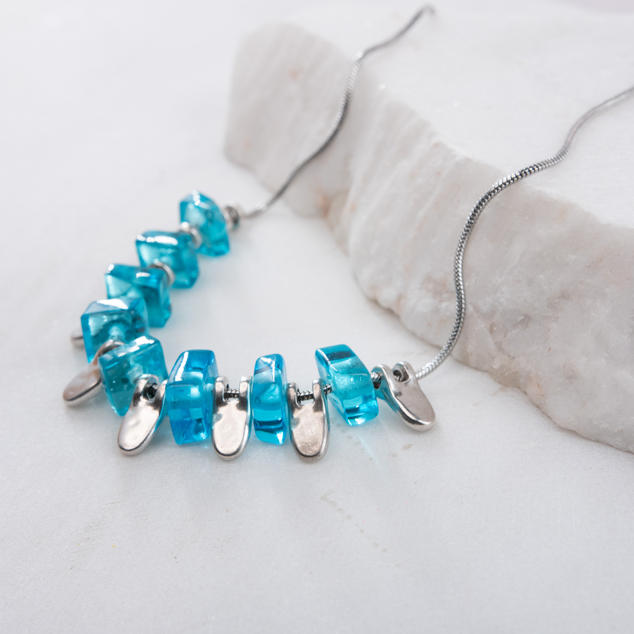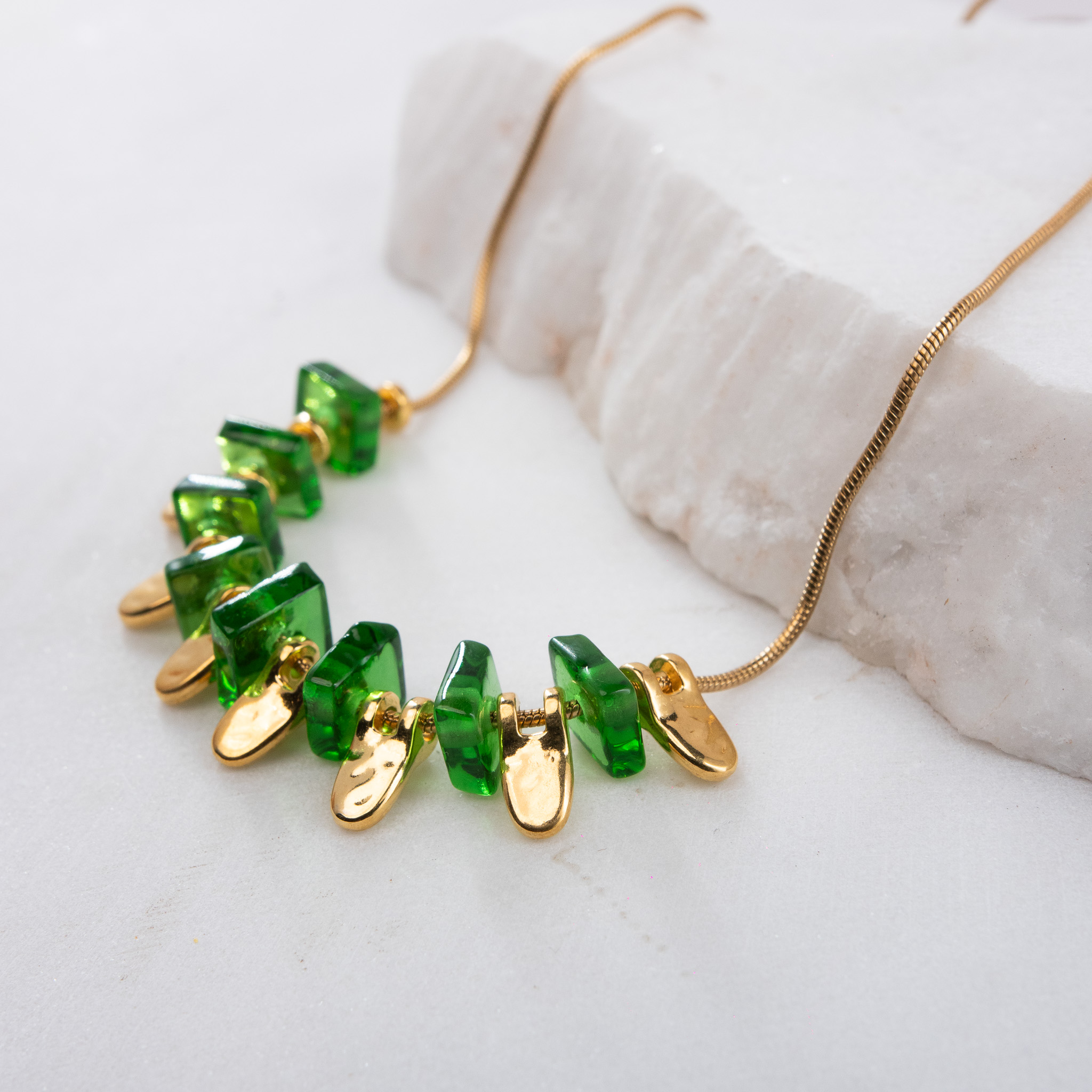 Κολιέ με σύνθεση γυάλινων και μεταλλικών στοιχείων, φτιαγμένο από ανακυκλωμένο πράσινο μπουκάλι μπύρας. Ατσάλινη αλυσίδα φίδι, πάχους 1,2mm και μήκους 45cm με αλυσιδάκι προέκτασης. Όλα τα μεταλλικά στοιχεία μας είναι ατσάλινα, υποαλλεργικά και χωρίς νικέλιο.