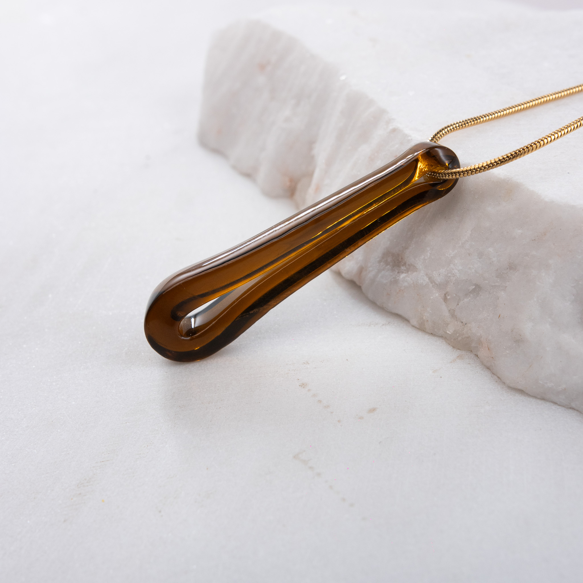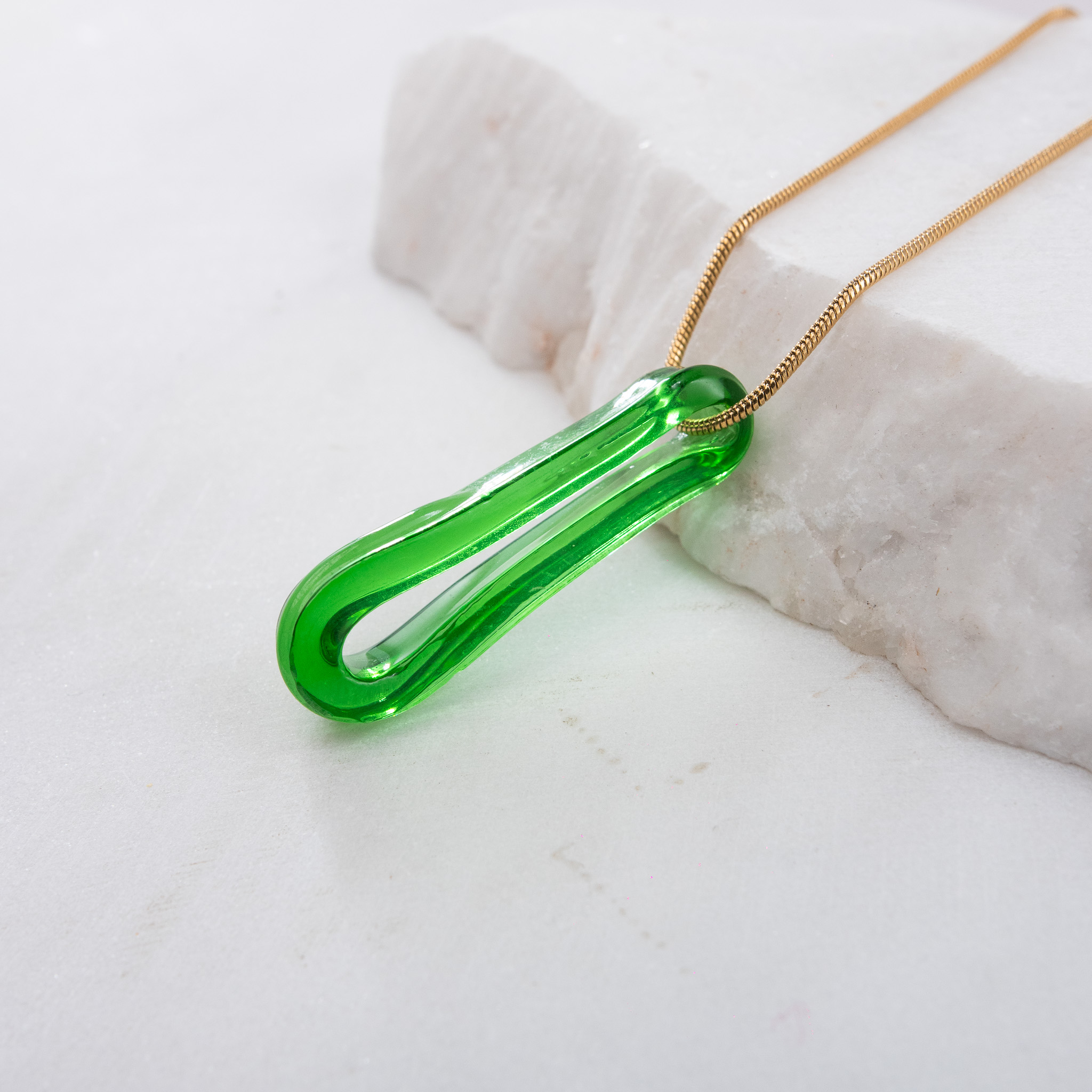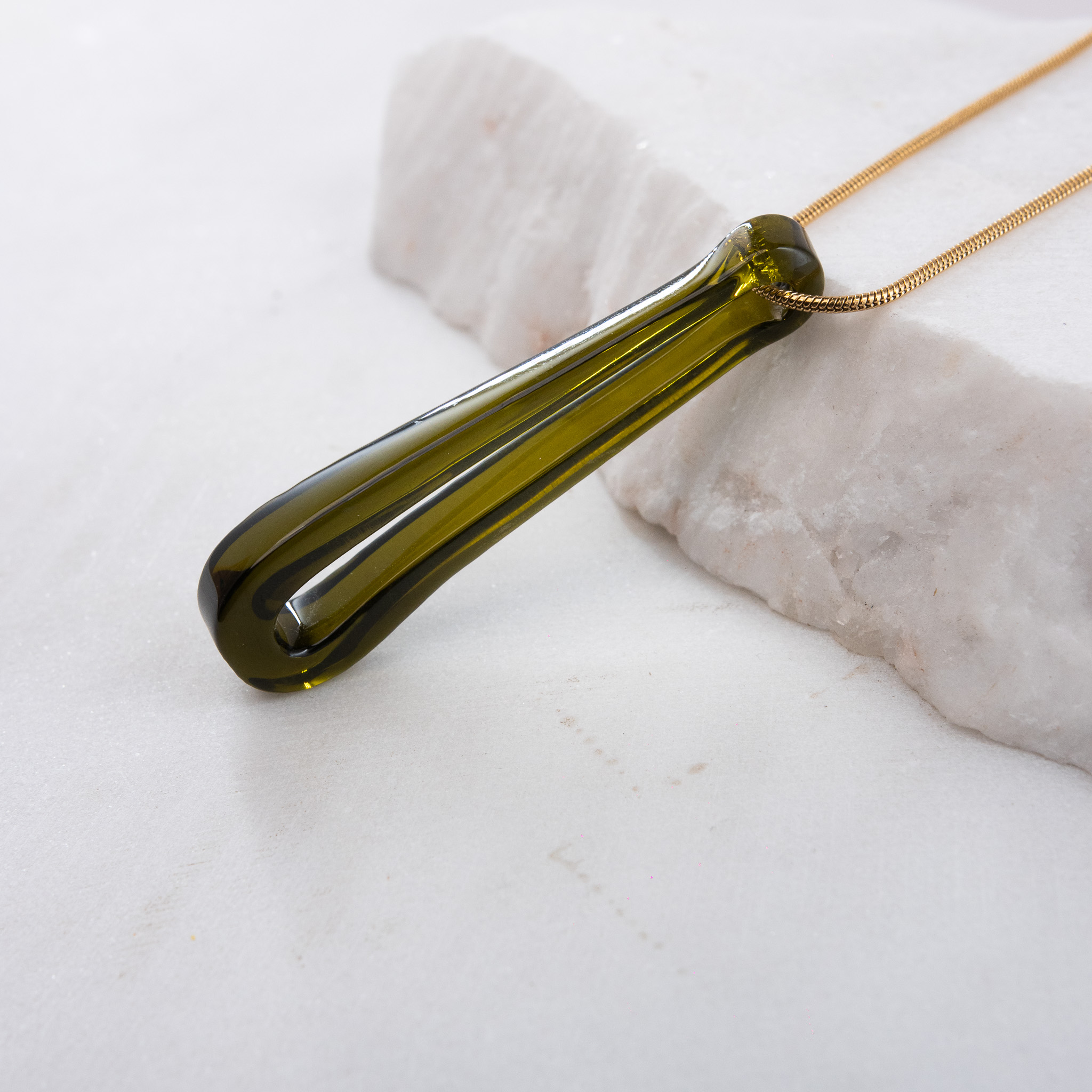 Κολιέ με γυάλινο στοιχείο από ανακυκλωμένο γυάλινο μπουκάλι Gin Bombay Sapphire, διαμορφωμένο στο χέρι και περασμένο σε αλυσίδα φίδι πάχους 1,2 mm από ανοξείδωτο ατσάλι. Το μήκος του κολιέ είναι 60 εκ., καθιστώντας το ιδανικό για layering — φοριέται τέλεια ως το πιο μακρύ στοιχείο σε συνδυασμό με δύο ή τρία κολιέ. Όλα τα μεταλλικά στοιχεία είναι από ανοξείδωτο ατσάλι, υποαλλεργικά και χωρίς νικέλιο, προσφέροντας άνεση και αντοχή στην καθημερινή χρήση.